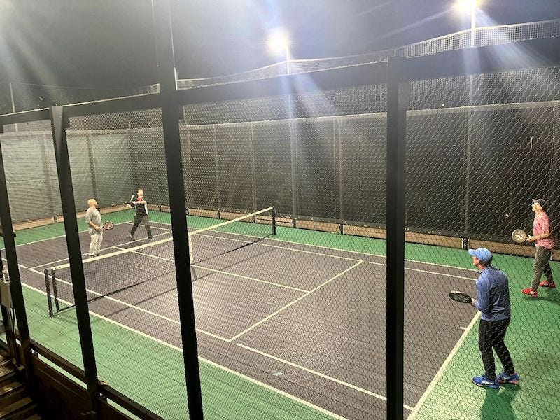 It’s played on a raised court (hence the name “platform tennis”) 1/3 the size of a tennis court surrounded by a 12’ high chicken wire cage. Invented in 1928 in New York by golfers looking for something active to do in the winter, the court was originally raised to allow shoveling snow off it. In later years, the raised platform allowed a convenient place to install propane heaters to melt snow and ice.